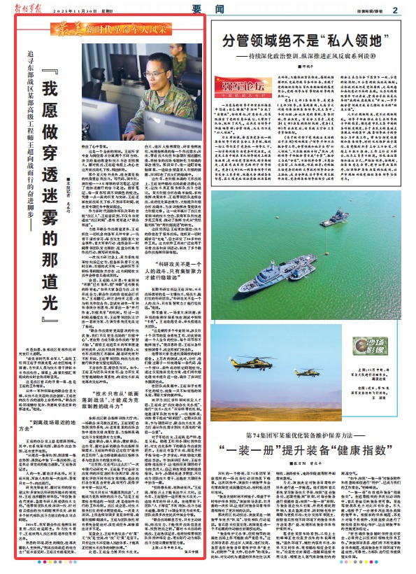 從單一軍種保障走向聯(lián)合信息支撐,從技術(shù)攻關(guān)邁向戰(zhàn)法創(chuàng)新,王超在向戰(zhàn)為戰(zhàn)的道路上奮勇沖鋒?!奥?lián)合戰(zhàn)場環(huán)境錯綜復雜,我愿做穿透迷霧的那道光?!彼f。