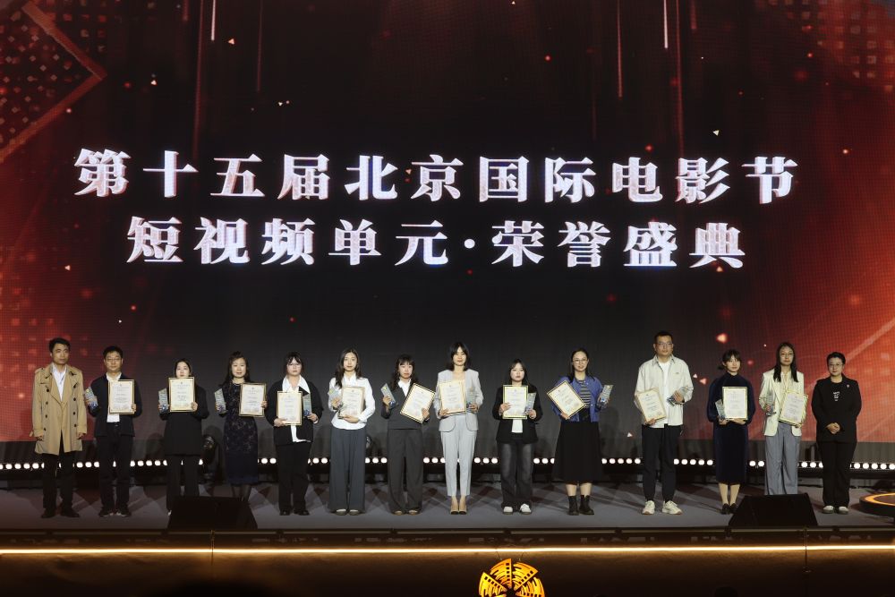 2025年4月25日,第十五屆北京國際電影節(jié)短視頻單元榮譽盛典在中國傳媒大學舉辦。這是獲獎選手上臺領獎。新華社記者 盧燁 攝