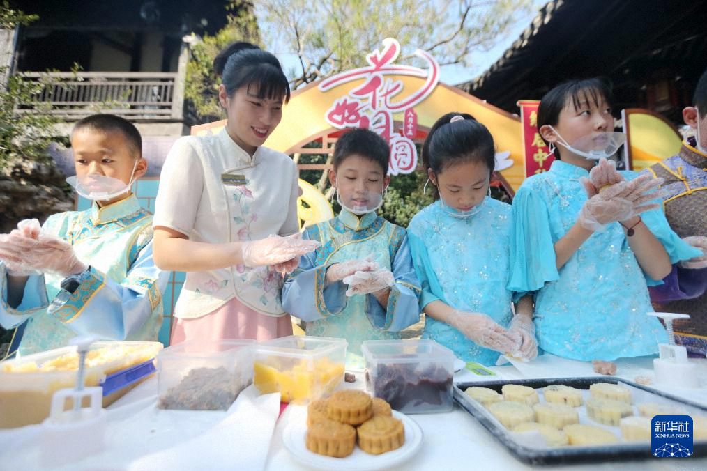 10月6日,在江蘇省揚(yáng)州市何園景區(qū),小朋友們在工作人員的指導(dǎo)下體驗(yàn)制作月餅。新華社發(fā)(孟德龍攝)