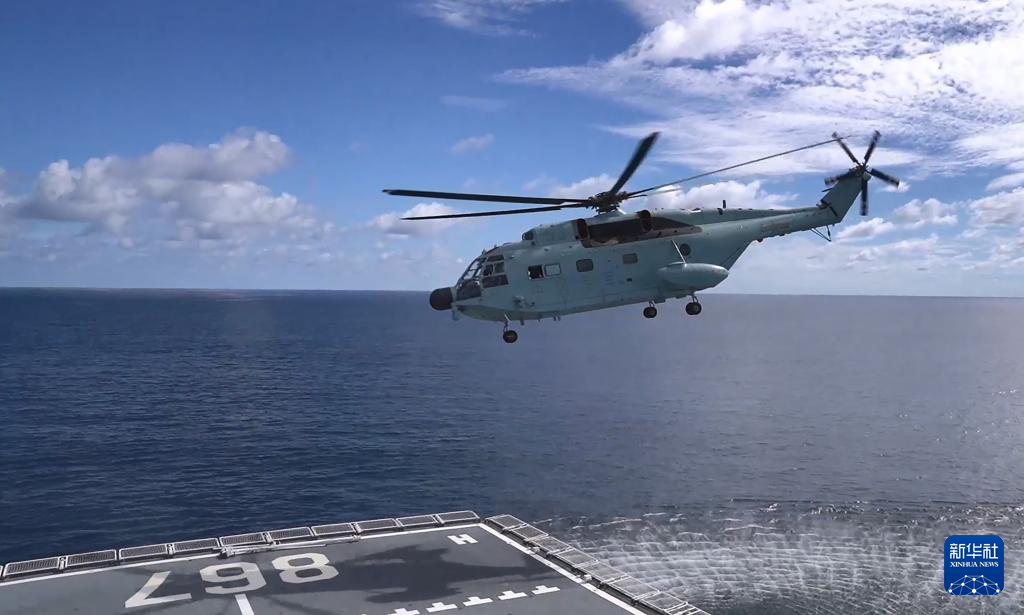 9月23日,艦載直升機從中國海軍“絲路方舟”號醫(yī)院船上起飛。新華社發(fā)