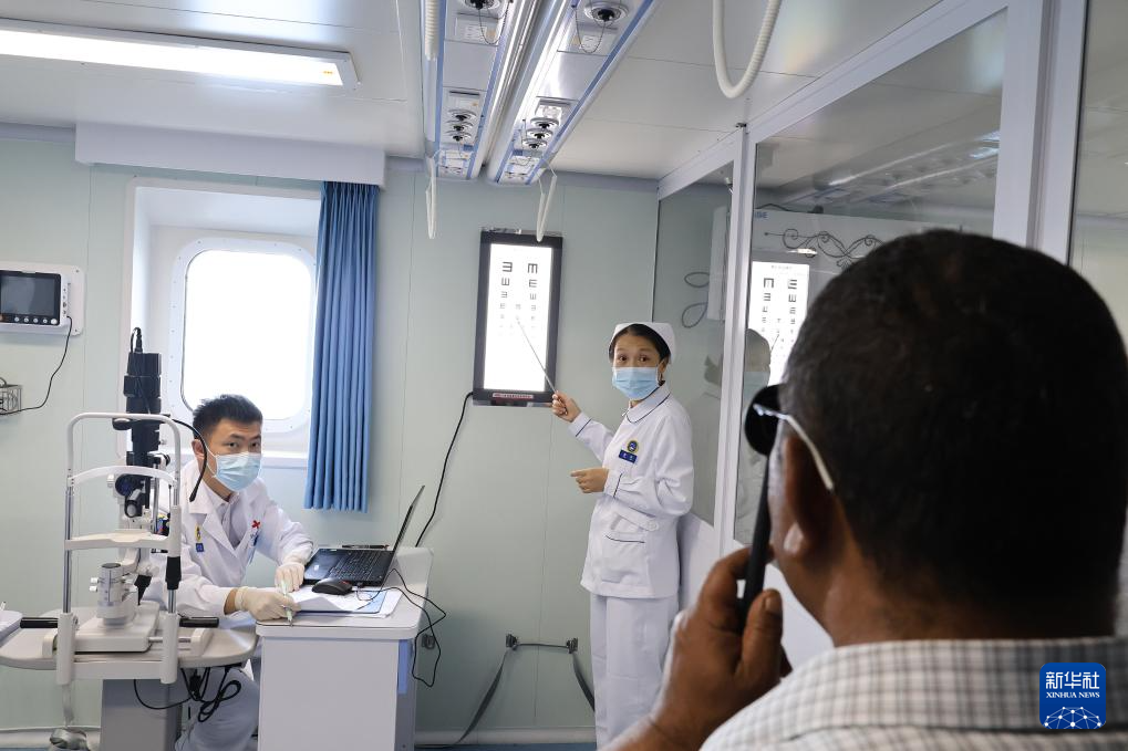 9月23日,中國海軍“絲路方舟”號醫(yī)院船醫(yī)護人員在瑙魯為當?shù)孛癖娺M行眼科檢查。新華社發(fā)(崔曉洋攝)