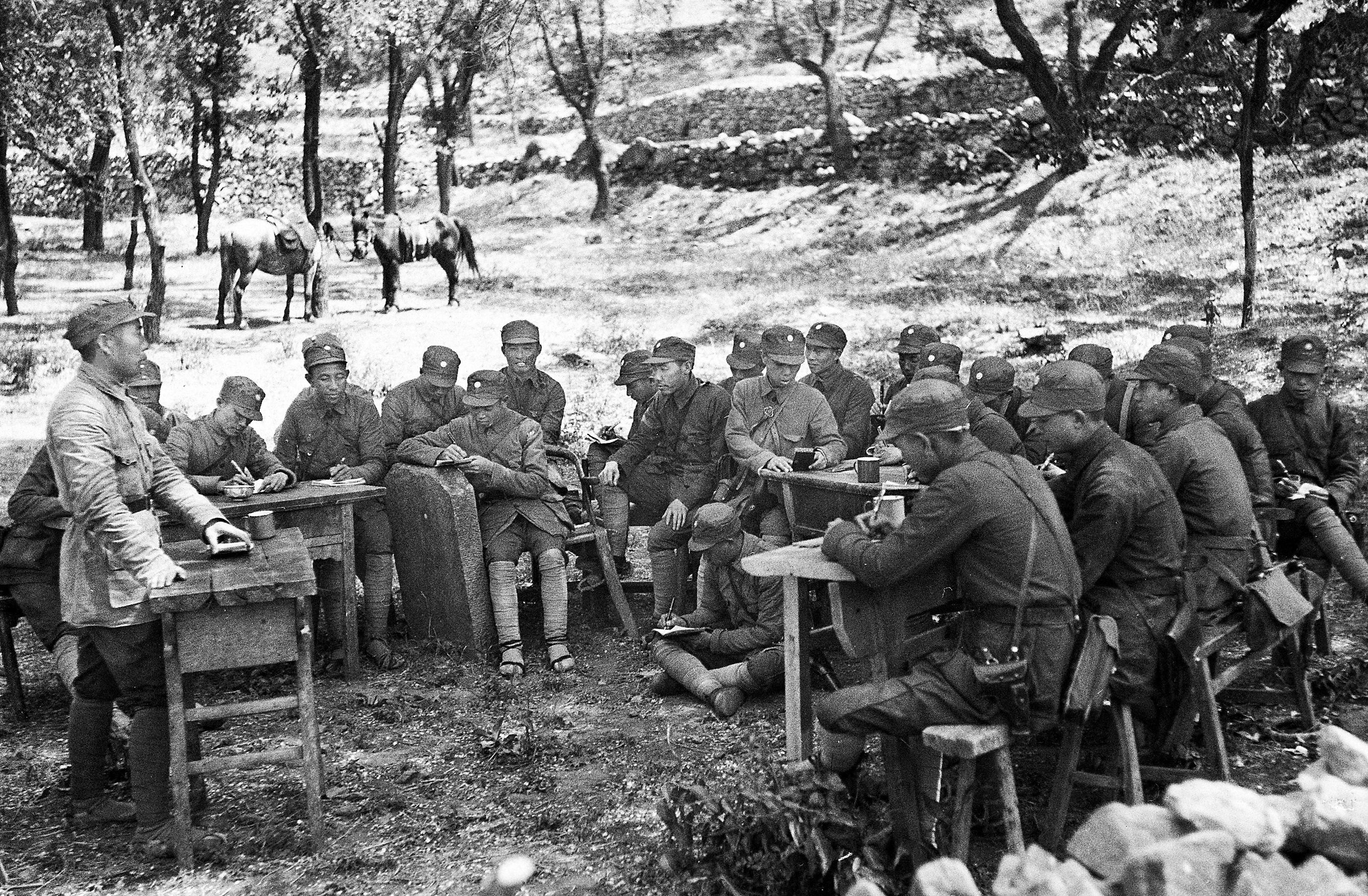 1939年12月,國(guó)民黨反動(dòng)派軍隊(duì)進(jìn)犯陜甘寧邊區(qū),八路軍359旅旅長(zhǎng)王震(左側(cè)站立者)召集干部會(huì)議,動(dòng)員部署保衛(wèi)黨中央。