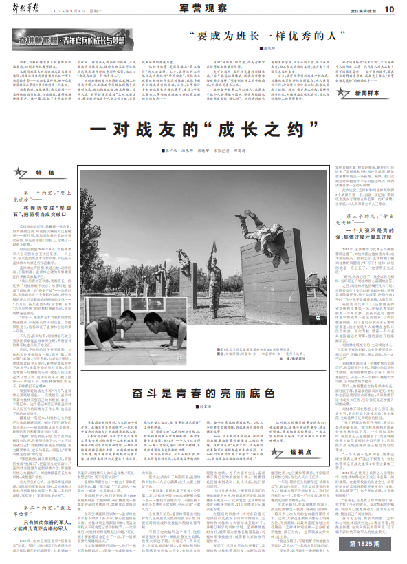 如今,站在新的軍旅起點(diǎn),他們相約在基層指揮員的新賽道上繼續(xù)奔跑。這對(duì)戰(zhàn)友的“成長(zhǎng)之約”,正是新時(shí)代革命軍人拼搏奮進(jìn)的生動(dòng)縮影。正如他們寫在約定書上的誓言:“強(qiáng)軍路上,我們要永遠(yuǎn)做彼此的參照系?!?/p>