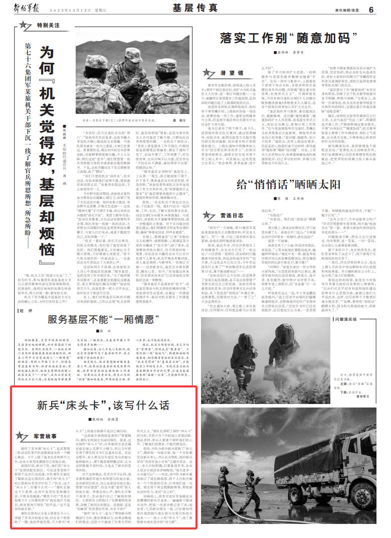 “制作‘床頭卡’,是為了幫助新兵明確前行方向、激發(fā)拼搏動(dòng)力,如果忽略他們的想法,這張卡片就成了好看無用的形式主義。”姜隊(duì)長講明了制作“床頭卡”的目的,并表示當(dāng)下年輕戰(zhàn)士思想活躍、想法多樣,帶兵人要善于傾聽他們的心聲、了解他們的需求,不能代替包辦。