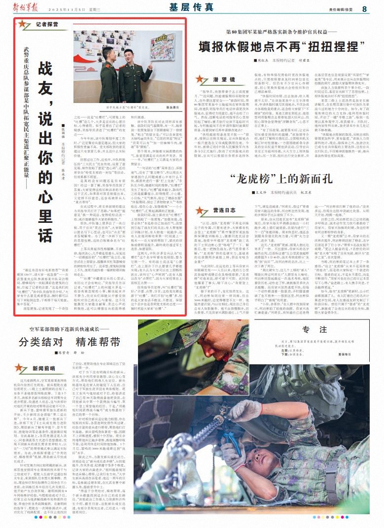“‘吐槽’中藏著官兵的心里話(huà),有回應(yīng)才會(huì)有響應(yīng)?!眳侵笇?dǎo)員告訴記者,“吐槽欄”上的問(wèn)題大多是一些容易被忽視的小事,解決起來(lái)并不費(fèi)力,但官兵們卻能從中感受到組織對(duì)自己的關(guān)心與重視。這不僅能激發(fā)大家建言獻(xiàn)策、表達(dá)心聲的積極性,還可以增強(qiáng)官兵的獲得感和歸屬感。