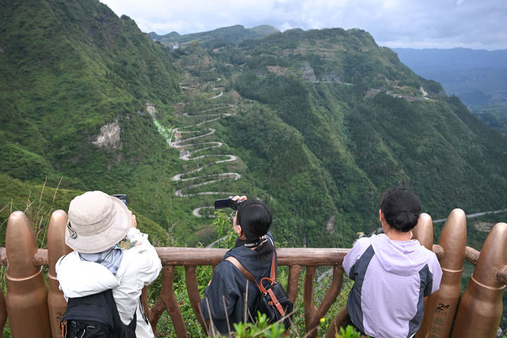 游客在貴州省晴隆縣二十四道拐觀景臺拍照(2025年10月6日攝,無人機(jī)照片)。新華社記者 楊文斌 攝