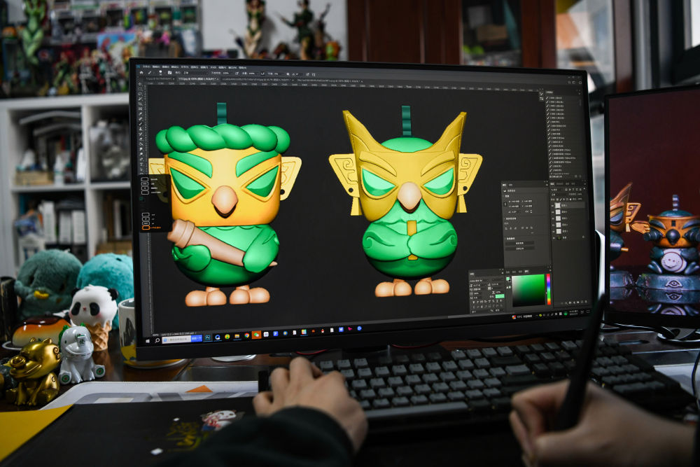 2025年3月1日,文創(chuàng)產(chǎn)品策劃運(yùn)營(yíng)師曾舟在位于四川成都的辦公室內(nèi)完善文創(chuàng)產(chǎn)品細(xì)節(jié)。他以三星堆青銅神樹(shù)、青銅縱目面具、青銅獸面等文物為創(chuàng)作藍(lán)本,結(jié)合潮玩元素設(shè)計(jì)的文創(chuàng)作品廣受歡迎。“我想做的不是玩具快消品,而是有內(nèi)容、有溫度、有意義的文化IP,讓年輕一代隨手摸到沉淀千年的文化?!痹壅f(shuō)。