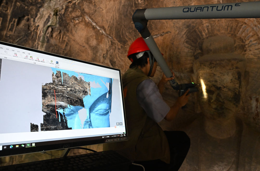 2025年4月9日,武漢大學(xué)文化遺產(chǎn)智能計(jì)算實(shí)驗(yàn)室團(tuán)隊(duì)成員在河南洛陽(yáng)龍門石窟魏字洞使用關(guān)節(jié)臂掃描儀對(duì)佛像進(jìn)行數(shù)字化掃描。從2005年起,龍門石窟研究院開(kāi)始為龍門石窟建立數(shù)字化檔案,借助激光掃描、高清攝影等技術(shù)手段收集文物數(shù)據(jù),以數(shù)字的形式留存千年石刻群的風(fēng)貌,致力于讓這一規(guī)模宏大、氣勢(shì)磅礴的石窟瑰寶“芳華永駐”。
