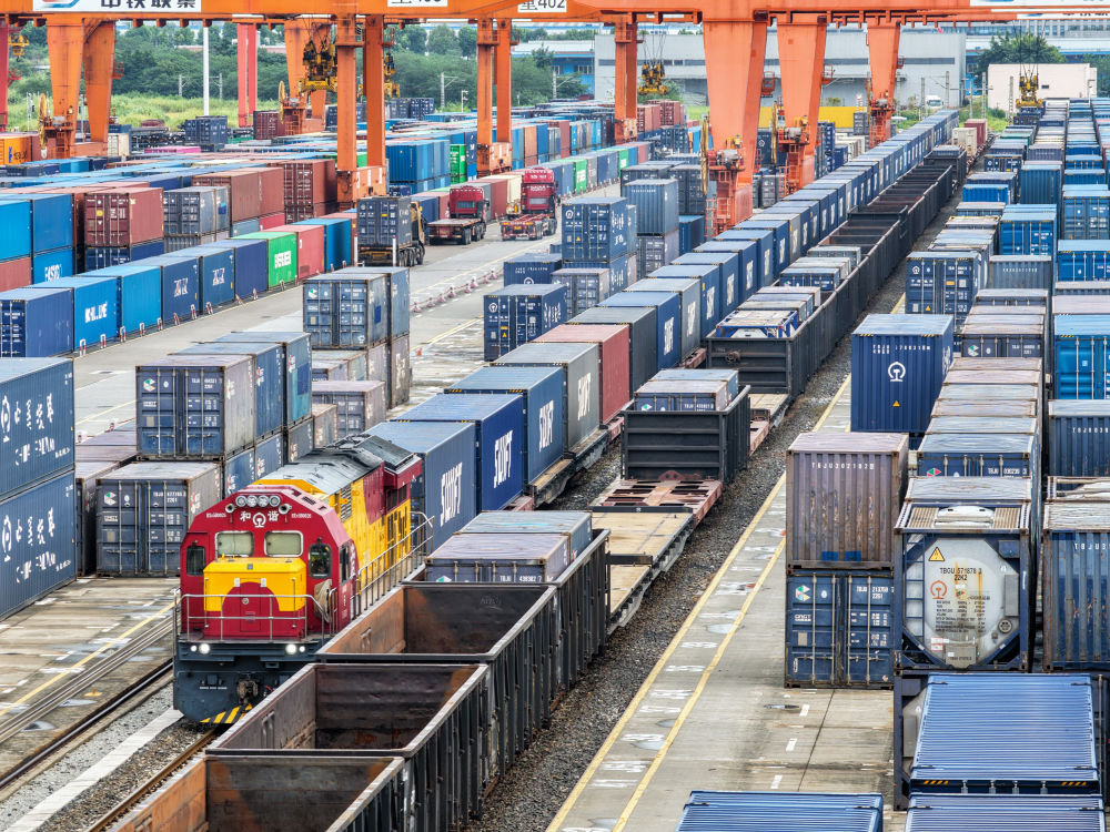 2025年9月8日,滿載“重慶造”汽車的中歐班列(成渝)在重慶團(tuán)結(jié)村中心站等待發(fā)車(無人機(jī)照片)。新華社記者 唐奕 攝