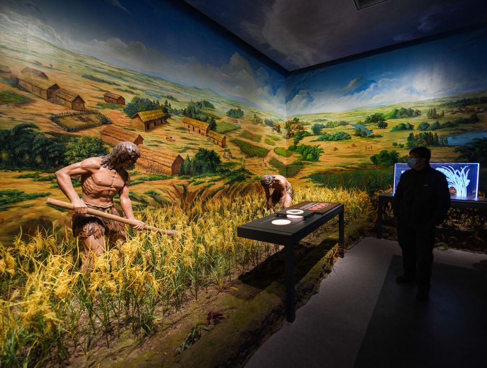 2022年1月21日,觀(guān)眾在成都市寶墩遺址展館參觀(guān)“寶墩遺址與寶墩文化展”。該展覽講述了寶墩文化時(shí)期,古蜀先民深入成都平原扎根繁衍、筑城而居、種植稻米等歷史。