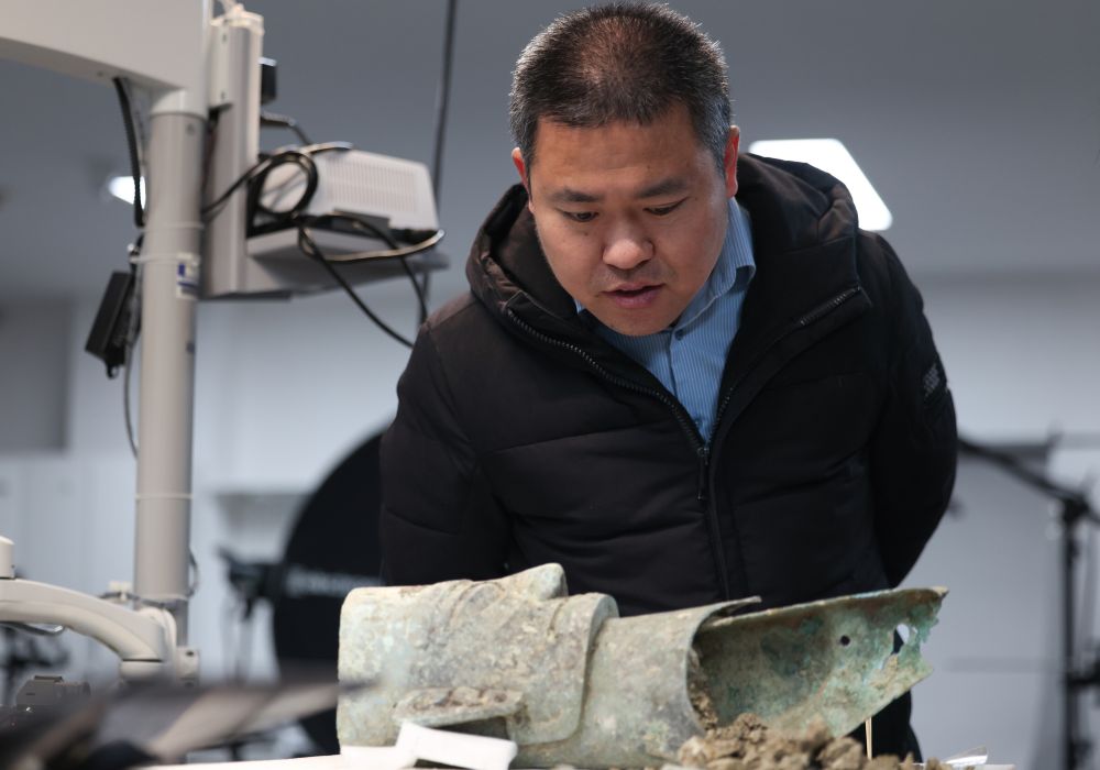 2024年12月16日,考古專(zhuān)家在三星堆研究院仔細(xì)查看一件青銅面具。當(dāng)日,古蜀文明保護(hù)傳承二期工程在三星堆研究院?jiǎn)?dòng)。