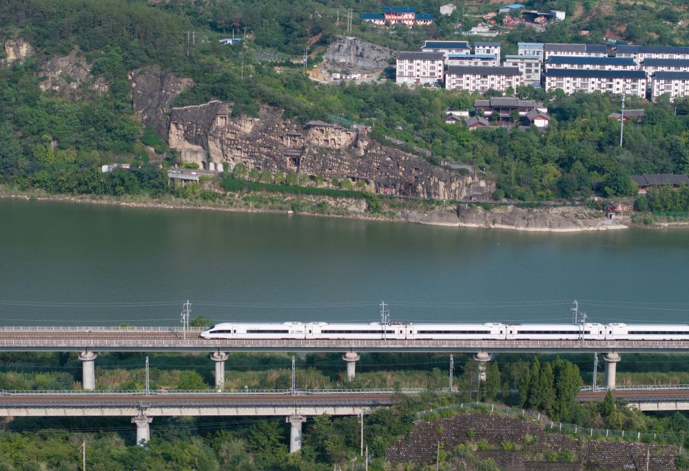 2025年7月18日,在四川省廣元市千佛崖景區(qū)對(duì)面的嘉陵江畔,一列高鐵列車(chē)運(yùn)行在西成高鐵上(無(wú)人機(jī)照片)。千佛崖腳下的金牛古蜀道和對(duì)岸的高鐵列車(chē),濃縮成一幅千年蜀道變遷圖。