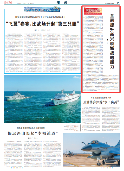 新興領(lǐng)域是新質(zhì)生產(chǎn)力和新質(zhì)戰(zhàn)斗力形成和存在的共性空間。新興領(lǐng)域戰(zhàn)略能力,關(guān)系我國經(jīng)濟(jì)社會高質(zhì)量發(fā)展,關(guān)系國家安全和軍事斗爭主動。如何全面提升新興領(lǐng)域戰(zhàn)略能力?黨的二十屆四中全會通過的《中共中央關(guān)于制定國民經(jīng)濟(jì)和社會發(fā)展第十五個五年規(guī)劃的建議》提出:“加快新興領(lǐng)域戰(zhàn)略能力建設(shè),推動新質(zhì)生產(chǎn)力同新質(zhì)戰(zhàn)斗力高效融合、雙向拉動?!边@為我們鞏固提高一體化國家戰(zhàn)略體系和能力、推動國防實(shí)力與經(jīng)濟(jì)實(shí)力同步提升,指明了方向。