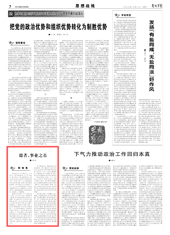 國無德不興,人無德不立。古今中外,凡有所成就者,無不嚴以修身、德行高尚?!恫烁T》有言:“德者,事業(yè)之基,未有基不固而棟宇堅久者?!边@告訴我們,個人的道德修養(yǎng)如同房屋地基,是事業(yè)穩(wěn)固發(fā)展的前提。我們要充分認識道德之于個人、之于社會的重要意義,把加強道德修養(yǎng)作為十分重要的人生必修課,勤于修煉道德操守,做到私德潤身、公德善心、大德鑄魂。