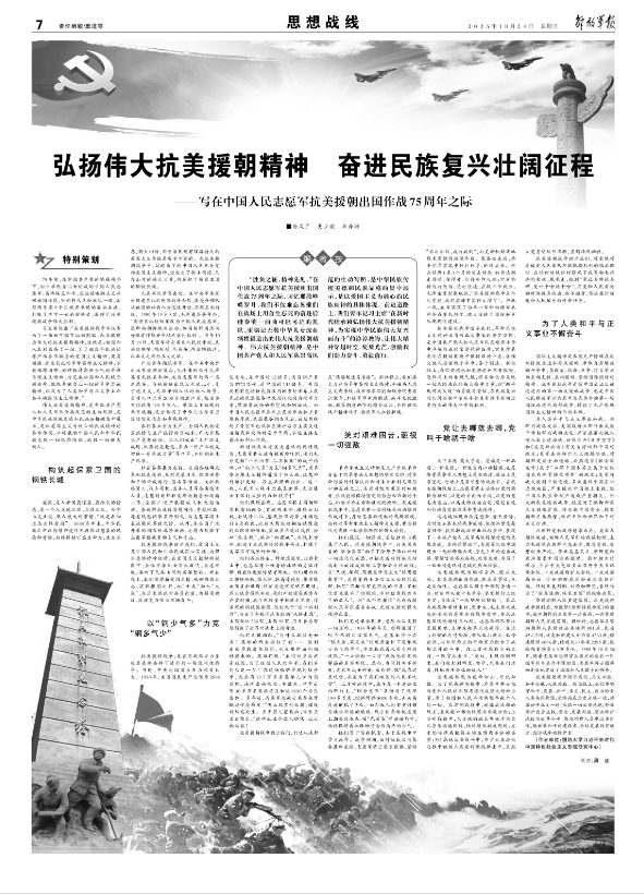 編者按 “勝負(fù)之征,精神先見(jiàn)?!痹谥袊?guó)人民志愿軍抗美援朝出國(guó)作戰(zhàn)75周年之際,回憶那段崢嶸歲月,我們不僅難忘英雄們?cè)趹?zhàn)場(chǎng)上用舍生忘死的前赴后繼奏響一曲曲可歌可泣的凱歌,更銘記無(wú)數(shù)中華兒女流血犧牲鍛造出的偉大抗美援朝精神。偉大抗美援朝精神,是中國(guó)共產(chǎn)黨人和人民軍隊(duì)崇高風(fēng)范的生動(dòng)寫(xiě)照,是中華民族傳統(tǒng)美德和民族品格的集中展示,是以愛(ài)國(guó)主義為核心的民族精神的具體體現(xiàn)。前進(jìn)道路上,我們要牢記習(xí)主席“在新時(shí)代繼承和弘揚(yáng)偉大抗美援朝精神,為實(shí)現(xiàn)中華民族偉大復(fù)興而奮斗”的諄諄教誨,讓偉大精神穿越時(shí)空、綻放光芒,激勵(lì)我們勠力奮斗、勇毅前行。