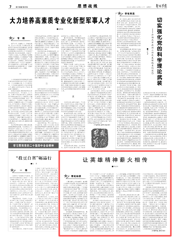 崇尚英雄,筑牢民族精神之基。英雄是國家的豐碑、民族的脊梁、社會的榮耀,理應(yīng)得到人們的尊崇。中華民族是崇尚英雄、成就英雄、英雄輩出的民族。自古以來,華夏大地上就誕生了許許多多的英雄人物,他們之所以在歷史長河中不斷綻放出耀眼的光芒,就在于其身上彰顯了中華民族的民族精神、其品格承載著中華文明的基因密碼。從“精忠報國”的岳飛、“留取丹心照汗青”的文天祥、令倭寇膽寒的戚繼光,到堅守四行倉庫的“八百壯士”、舍生取義的“狼牙山五壯士”、用胸膛堵槍眼的黃繼光……他們以熱血生命高擎精神火炬,以犧牲奉獻校準價值坐標,以理想之光照亮前行之路,讓偉大民族精神得以延續(xù)升華。崇尚英雄,是一個國家、一個民族和一支軍隊對英雄人物共同的認同、褒揚和崇敬,是激發(fā)英雄主義與愛國主義精神、凝聚民族感情與國家意志的動力源泉。我們必須銘記歷史、緬懷英烈,充分發(fā)揮英雄的引領(lǐng)示范作用,激發(fā)每一個中國人的民族自豪感和國家榮譽感,矢志為國家各項事業(yè)的發(fā)展進步不懈奮斗。