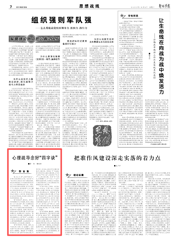 “切”須切要害、解難題。把握關(guān)鍵點、找準突破口,才能以最優(yōu)方法找準“病”根、對癥下“藥”。要突出重點人員,大項任務(wù)前及時跟進掌握官兵心理變化,做好思想工作“精準滴灌”,做到及時發(fā)現(xiàn)、防患未然。要建立心理隱患預防機制,常態(tài)化排查風險隱患,從源頭筑牢心理防線,把問題消滅在萌芽階段。要持續(xù)跟蹤效果,建立“一人一檔”回訪機制,根據(jù)反饋動態(tài)及時調(diào)整疏導方法、固化經(jīng)驗做法,確保問題不反彈、疏導有長效。