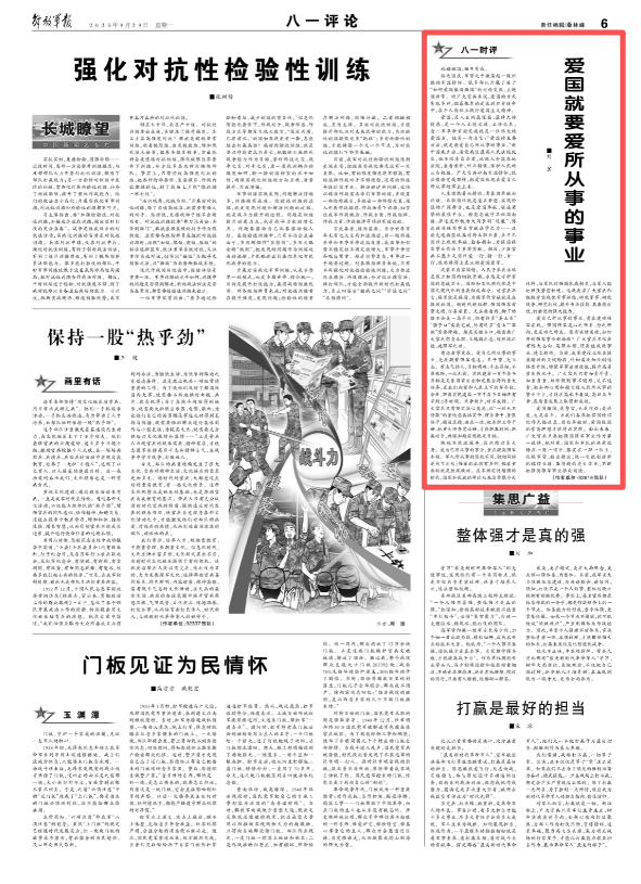 愛自己所從事的事業(yè),貴在建功強軍實踐。強國強軍是心之所系、行之所向,更是功之所成。沒有實績實效,如何開創(chuàng)強軍事業(yè)新局面?廣大官兵不僅要有遠大志向、高強本領,還要能成就事業(yè)、建立新功。當前,我軍建設正處在提質增效的關鍵階段,迫切需要加快訓練轉型升級,增強軍事治理效能,提升高質量發(fā)展水平。廣大官兵只有知責盡責、知重負重,始終做到事不避難、義不逃責,把全部心思和精力投入到所從事的事業(yè)中去,才能在高水平備戰(zhàn)、高效益斗爭、高質量發(fā)展上取得新成效。