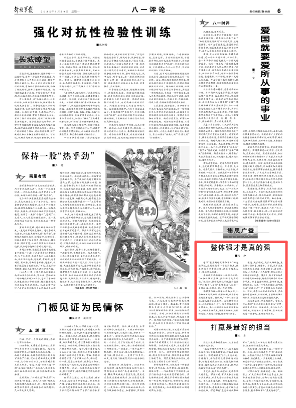 獨木不成林,單兵難排陣。帶兵人應向那些“最美新時代革命軍人”學習,樹牢大局意識、系統(tǒng)觀念,不僅把自己搞過硬,還要把人才培養(yǎng)好,真正做到既為一域爭光、更為全局添彩。
