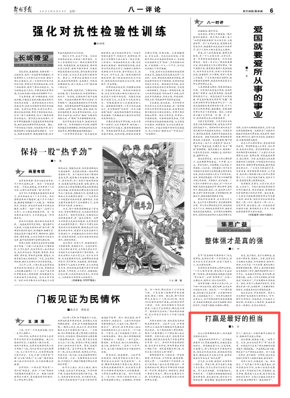 當尖兵、打頭陣、挑重擔,是革命軍人的本色。事實證明,有多大擔當才能干多大事業(yè),盡多大責任才會有多大成就。軍人生來為戰(zhàn)勝。如何展現(xiàn)擔當、體現(xiàn)作為,一個最根本的檢驗指標就是看軍事素養(yǎng)、看打贏本領(lǐng),看對戰(zhàn)斗力的貢獻率。探究那些“最美新時代革命軍人”,他們無一不把打贏作為最好擔當、把勝利作為最大奉獻。