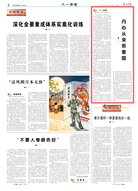 “我站立的地方是中國(guó),我用生命捍衛(wèi)守候,哪怕風(fēng)似刀來(lái)山如鐵,祖國(guó)山河一寸不能丟……”人民軍隊(duì)從誕生之日起,就把自己與國(guó)家、民族的命運(yùn)緊緊聯(lián)系在一起,一代代革命軍人赤誠(chéng)愛(ài)國(guó)、以身許國(guó)、精忠報(bào)國(guó),樹(shù)立起一座座愛(ài)國(guó)奉獻(xiàn)的不朽豐碑。在強(qiáng)國(guó)建設(shè)、民族復(fù)興的新征程上,我們應(yīng)繼續(xù)高擎愛(ài)國(guó)主義偉大旗幟,厚植愛(ài)黨、愛(ài)國(guó)、愛(ài)社會(huì)主義的情感,將愛(ài)國(guó)之情化為報(bào)國(guó)之志、強(qiáng)軍之行,忠實(shí)履行新時(shí)代使命任務(wù),爭(zhēng)做愛(ài)國(guó)主義精神的堅(jiān)定弘揚(yáng)者、實(shí)踐者和傳播者。