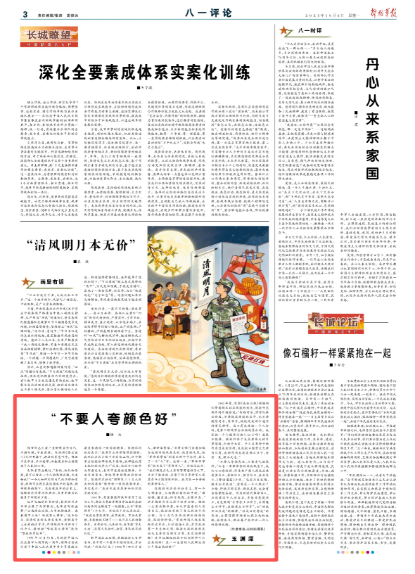 “不要人夸顏色好,只留清氣滿乾坤?!睆睦弦惠吀锩业淖咳伙L(fēng)范中,我們可以感悟到,作為共產(chǎn)黨人到底應(yīng)該看重什么、看輕什么,堅守什么、舍棄什么?!顿Y治通鑒》上講,“逃名而名我隨,避名而名我追”,意思是一個人做出了業(yè)績,即使不圖名譽(yù)、避談名譽(yù),也會有名譽(yù)緊隨其后。作為新時代革命軍人,應(yīng)該看淡個人功與名,多想為黨建功業(yè),自覺做到“在榮譽(yù)上不伸手,在待遇上不伸手,在物質(zhì)上不伸手”,以“功成不必在我”的胸襟、“功成必定有我”的作為,在強(qiáng)國強(qiáng)軍的新征程上銜枚疾馳、接續(xù)奮斗,跑出屬于我們這一代人的最好成績。
