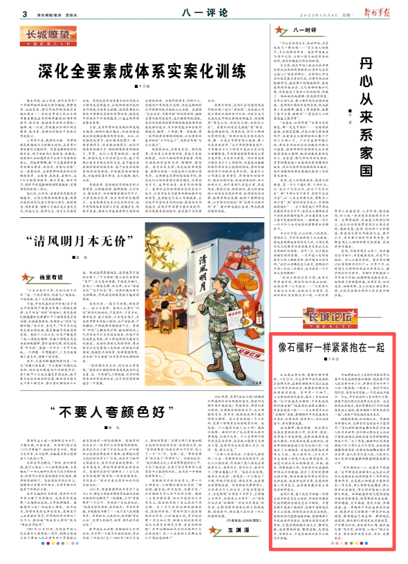 “軍民團(tuán)結(jié)如一人,試看天下誰(shuí)能敵?!比娞貏e是駐疆部隊(duì)?wèi)?yīng)充分認(rèn)清軍隊(duì)在做好民族團(tuán)結(jié)進(jìn)步工作中的優(yōu)勢(shì)和作用,自覺(jué)服從和服務(wù)于黨和國(guó)家工作大局,帶頭維護(hù)民族團(tuán)結(jié),帶頭維護(hù)社會(huì)穩(wěn)定,帶頭維護(hù)各族人民的根本利益。牢牢把握新時(shí)代黨的治疆方略的原則要求,統(tǒng)籌推進(jìn)依法治疆、團(tuán)結(jié)穩(wěn)疆、文化潤(rùn)疆、富民興疆、長(zhǎng)期建疆,進(jìn)一步鑄牢中華民族共同體意識(shí),像愛(ài)護(hù)自己的眼睛一樣愛(ài)護(hù)民族團(tuán)結(jié),像珍視自己的生命一樣珍視民族團(tuán)結(jié),模范執(zhí)行黨的民族宗教政策,嚴(yán)守群眾紀(jì)律,密切軍民之間、各民族之間“同呼吸、共命運(yùn)、心連心”的血肉關(guān)系,堅(jiān)決維護(hù)國(guó)家主權(quán)、安全、發(fā)展利益。