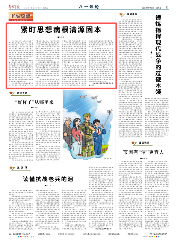 源清則流清,源濁則流濁。回顧歷史不難發(fā)現(xiàn),我黨我軍開展的每次整訓(xùn),都注重緊盯思想病根清源固本?!摆M南三整”堅持糾正不能用馬克思列寧主義來分析革命形勢這個根本問題,讓大家在思想深處上有新認識;新泉整訓(xùn)大力開展思想政治教育運動,以使紅四軍所有人在思想根子上有大的變化;延安整風(fēng)運動緊緊抓住端正信念、保持人民軍隊本色等源頭問題入手……正是我黨我軍在整訓(xùn)中堅持找準病根、靶向治療,才確保了整訓(xùn)取得實效。