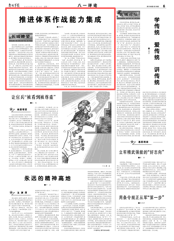 戰(zhàn)要聯(lián)合打,兵要體系練。近年來,我軍十分注重加強(qiáng)體系作戰(zhàn)能力建設(shè),通過改革體制、構(gòu)建體系、實(shí)戰(zhàn)訓(xùn)練、常態(tài)演訓(xùn),較好實(shí)現(xiàn)了力量上“合”、行動(dòng)上“聯(lián)”、效能上“優(yōu)”、指揮上“統(tǒng)”。同時(shí),我軍作戰(zhàn)體系還有不少短板弱項(xiàng),譬如裝備、戰(zhàn)場、人才、訓(xùn)練條件等還沒有深度融合等問題依然存在。倘若關(guān)鍵作戰(zhàn)要素鑼齊鼓不齊,就會(huì)成為制約作戰(zhàn)能力形成的瓶頸問題。要實(shí)現(xiàn)聯(lián)合作戰(zhàn)能力整體提升,就必須推進(jìn)體系作戰(zhàn)能力集成,下大力解決好體系抓建難題。