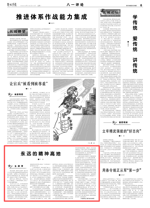 一個(gè)人的脊梁,不是骨頭,而是靈魂;一支軍隊(duì)的支柱,不是武器,而是精神。毛澤東同志評價(jià)抗美援朝戰(zhàn)爭時(shí)曾說:“志愿軍打敗了美國佬,靠的是一股氣,美軍不行,鋼多氣少?!睔鉃楸?,勇為兵本。氣,指的就是軍人的戰(zhàn)斗精神。我軍歷來是打精氣神的,以敢打敢拼聞名于世。從萬里長征的“三軍過后盡開顏”,到抗日戰(zhàn)爭的“驅(qū)逐倭兒共一樽”,到解放戰(zhàn)爭的“天翻地覆慨而慷”,再到抗美援朝的“擊潰強(qiáng)敵奏凱歌”,一場場以弱勝強(qiáng)的戰(zhàn)斗,靠的就是“壓倒一切敵人,而決不被敵人所屈服”的精氣神。