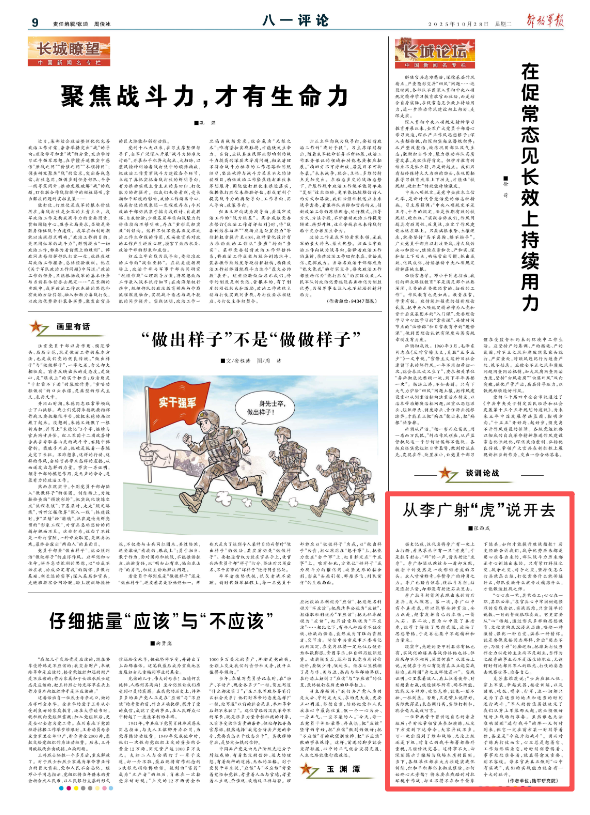 李廣拉弓射箭所表現(xiàn)出來的前后差異,發(fā)人深思。第一次,李廣心中有個真老虎,所以能夠全神貫注、全力以赴,超常發(fā)揮自己的本領(lǐng),一箭入石。第二次,因為心中沒了真老虎,就等于解除了思想武裝,放松了思想警惕,于是再也集中不起精神和力量來。