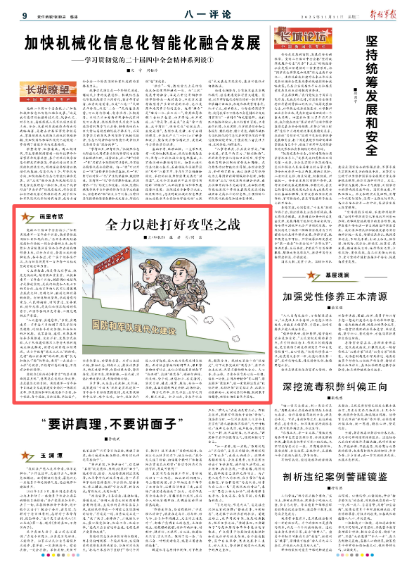 黨的二十屆四中全會(huì)指出:“如期實(shí)現(xiàn)建軍一百年奮斗目標(biāo),高質(zhì)量推進(jìn)國(guó)防和軍隊(duì)現(xiàn)代化?!比姼骷?jí)及時(shí)把思想和行動(dòng)統(tǒng)一到全會(huì)精神上來(lái),把智慧和力量凝聚到落實(shí)全會(huì)作出的戰(zhàn)略部署上來(lái),以全力以赴、務(wù)期必成的精神狀態(tài),奮斗奮進(jìn)、苦干實(shí)干的務(wù)實(shí)作風(fēng),為打好實(shí)現(xiàn)建軍一百年奮斗目標(biāo)攻堅(jiān)戰(zhàn)貢獻(xiàn)全部力量。