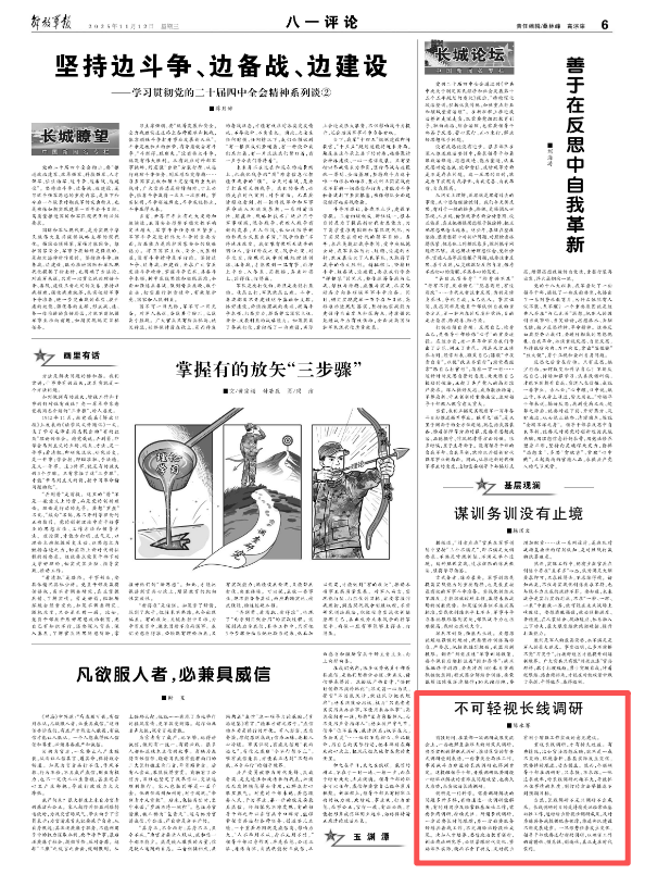 前段時(shí)間,在某部一次調(diào)研成果交流會(huì)上,一些破解復(fù)雜難點(diǎn)的對(duì)策式調(diào)研、典型案例的解剖式調(diào)研、推動(dòng)落實(shí)的督查式調(diào)研受到表揚(yáng),一些事關(guān)全局性工作、事關(guān)戰(zhàn)斗力建設(shè)的長(zhǎng)線調(diào)研也得到肯定。這提醒領(lǐng)導(dǎo)干部,開展調(diào)研既要圍繞一時(shí)難以解決的重難點(diǎn)問題攻堅(jiān),也要久久為功,扎實(shí)做好長(zhǎng)線調(diào)研。