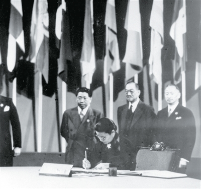 ▲1945年6月26日,參加聯(lián)合國憲章制憲大會的中國代表吳貽芳在憲章上簽字。 新華社發(fā)