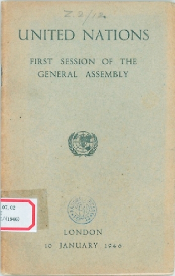 ▲重慶圖書館藏的《第一屆聯(lián)合國大會第一次會議》(1946年)?!?span tag="ueditor-text-tushuo" class="imgdesc" style="text-indent: 2em; ">重慶圖書館供圖