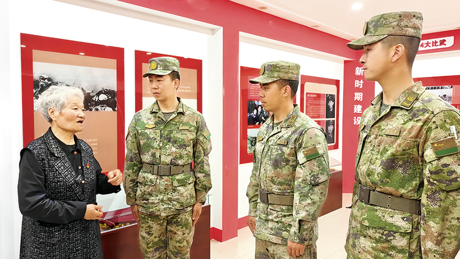 ▲李家發(fā)的妹妹李家英給某部“紅一連”官兵講述哥哥的英雄事跡?!∽髡吖﹫D