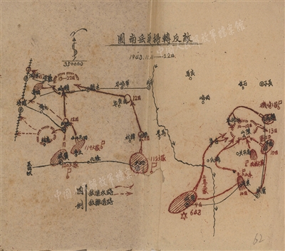 ▲解放軍檔案館館藏檔案1943年《敵反轉(zhuǎn)掃蕩岳南圖》。