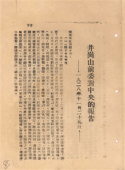 ▲《井岡山前委對(duì)中央的報(bào)告》首頁(yè),該報(bào)告收錄在1945年中共山東分局印發(fā)的《黨的路線問(wèn)題選集》?!〗夥跑姍n案館提供