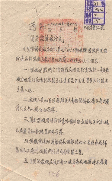 在這份檔案中,晉察冀軍區(qū)司令部詳細(xì)列出了在救護(hù)飛行員過(guò)程中可能遇到的各類情況和相應(yīng)處理辦法,使救護(hù)工作有章可循, 救援過(guò)程清晰明確。從指示的內(nèi)容可以看出, 晉察冀軍區(qū)對(duì)救護(hù)盟軍飛行員工作極為重視,是把盟軍飛行員當(dāng)成自己的戰(zhàn)友、兄弟一樣來(lái)對(duì)待。事實(shí)證明,清晰、細(xì)致的救助工作部署,大大提高了遇險(xiǎn)盟軍飛行員的存活率。