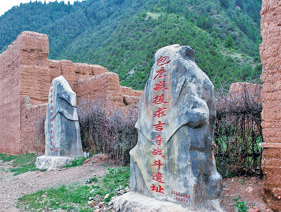 從四川省若爾蓋縣出發(fā),沿蜿蜒山路行駛約40分鐘,一處殘垣斷壁映入眼簾。厚達(dá)1米多、高達(dá)5米多的黃土圍成的四面墻,依稀勾勒出房屋輪廓。土墻前矗立的紀(jì)念碑上,鐫刻著“包座戰(zhàn)役求吉寺戰(zhàn)斗遺址”字樣。