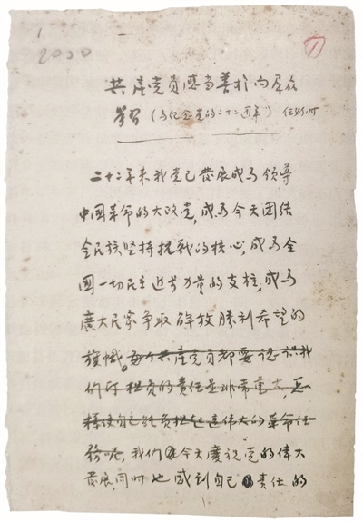 ▲任弼時(shí)同志于1943年6月寫下的《共產(chǎn)黨員應(yīng)當(dāng)善于向群眾學(xué)習(xí)》?!≈醒霗n案館藏