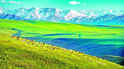 ▲在巴爾魯克雪山映照下,巴什拜羊在廣袤的草原上悠然吃草?!≡C窨h融媒體中心供圖