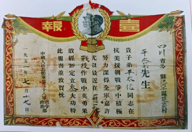 ▲1951年7月,中國人民志愿軍第38軍給平太信家人發(fā)回的立功喜報。