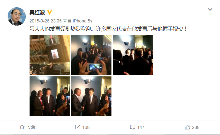 時(shí)任聯(lián)合國(guó)副秘書(shū)長(zhǎng)吳紅波說(shuō),習(xí)主席走下講臺(tái)時(shí),二三十位其他國(guó)家領(lǐng)導(dǎo)人排隊(duì)與他握手表示祝賀,走廊里擠得滿(mǎn)滿(mǎn)當(dāng)當(dāng)。