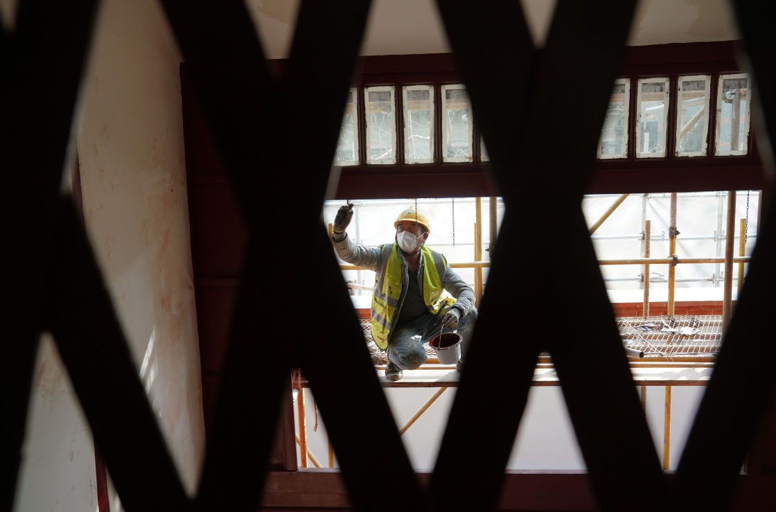 2021年1月14日,工人在修繕現(xiàn)場(chǎng)施工。2020年11月17日起,中共一大會(huì)址及原展廳暫停對(duì)外開放實(shí)施修繕改造。新華社記者 劉穎 攝