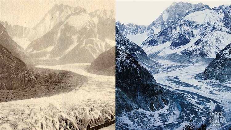 △去年2月,馬克龍總統(tǒng)到訪位于法國阿爾卑斯山勃朗峰山區(qū)的冰海冰川。作為法國最長的冰川,近些年它因全球暖化而急劇萎縮。這是馬克龍總統(tǒng)在個人社交媒體上發(fā)布的冰川消融對比照片(左為1910年,右為2020年)。