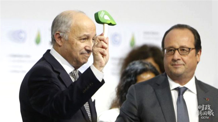 △2015年12月12日,巴黎氣候變化大會主席、法國外長法比尤斯舉起帶有大會標志的綠色小錘,宣告里程碑式的《巴黎協(xié)定》誕生。(資料圖)