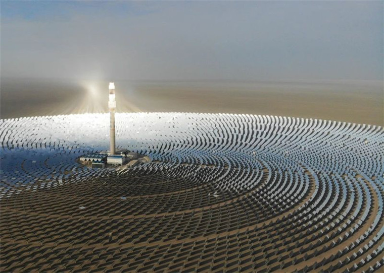 △我國加快發(fā)展新能源和可再生能源,能源消費(fèi)結(jié)構(gòu)不斷優(yōu)化,能源綠色低碳轉(zhuǎn)型深入推進(jìn),清潔能源消費(fèi)比重持續(xù)提高,可再生能源裝機(jī)快速增長。圖為被稱為“超級鏡子發(fā)電站”的首航高科敦煌100兆瓦熔鹽塔式光熱電站在戈壁灘上閃耀。