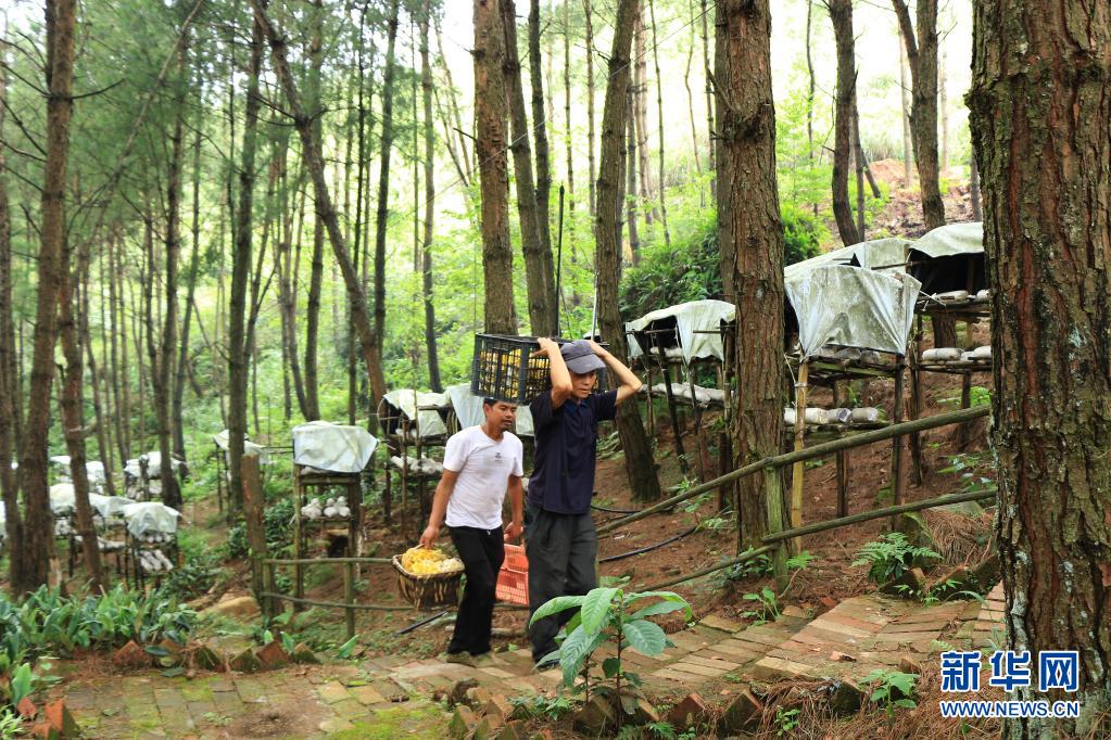 當地群眾在貴州省六盤水市六枝特區(qū)月亮河鄉(xiāng)的花德河國有林場內收獲菌類(2021年7月24日攝)。 新華社發(fā)(令狐榮駿 攝)
