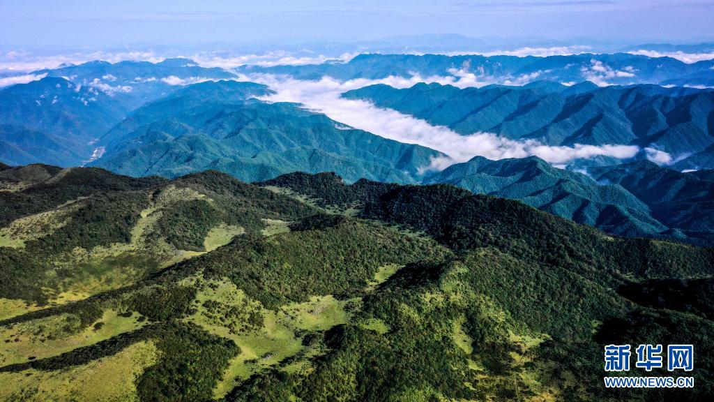 雨后初霽,位于陜西省漢中市留壩縣的紫柏山國家森林公園內云霧升騰,宛如畫境(2020年9月17日攝,無人機照片)。 新華社記者 劉瀟 攝